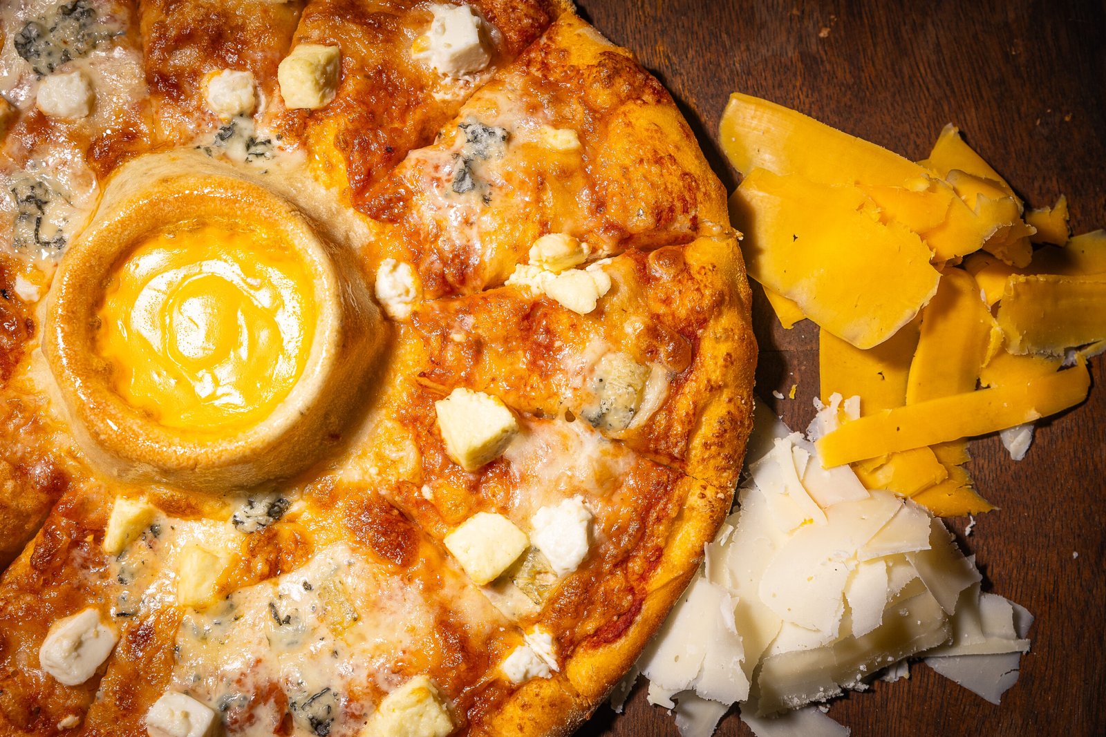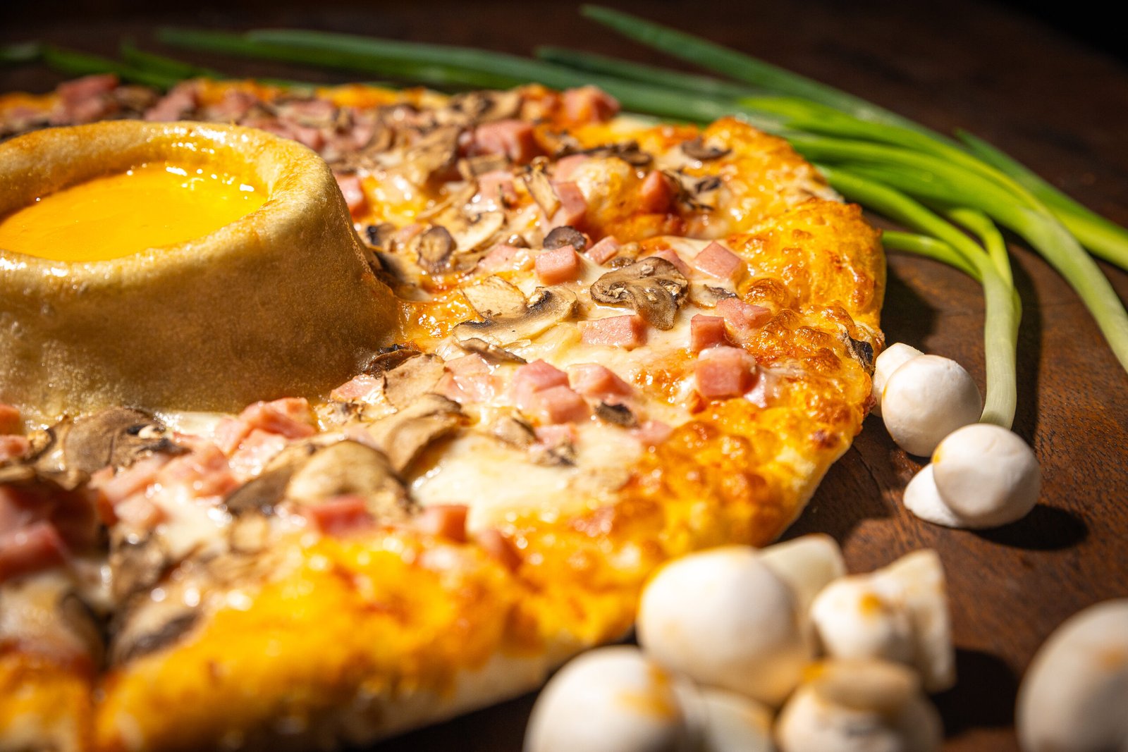 Padažas, karamelizuoti svogūnai, keptas faršas, itališkas sūris mocarela, marinuoti pievagrybiai, marinuotos aitriosios paprikos, rukola.
