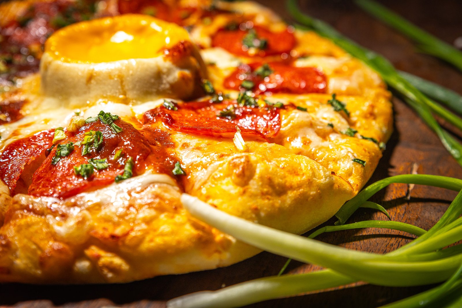 Padažas, sūris mocarela, Pepperoni dešra, svogūnų laiškai, naminis „Santa Fe” padažas, čederio sūrio padažas